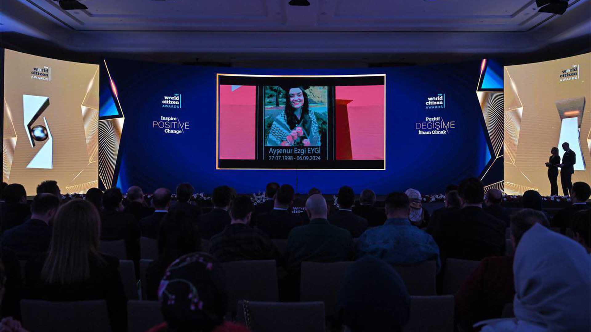 ذهبت جائزة “World Citizen of the Year” إلى عائشة نور أزغي أيغي، التي قُتلت برصاص قوات الجيش الإسرائيلي بشكل مأساوي خلال احتجاج في نابلس في 6 سبتمبر 2024. وتسلم والدها محمد سوات أيغي الجائزة من رئيس الاتصالات فخر الدين ألتون.